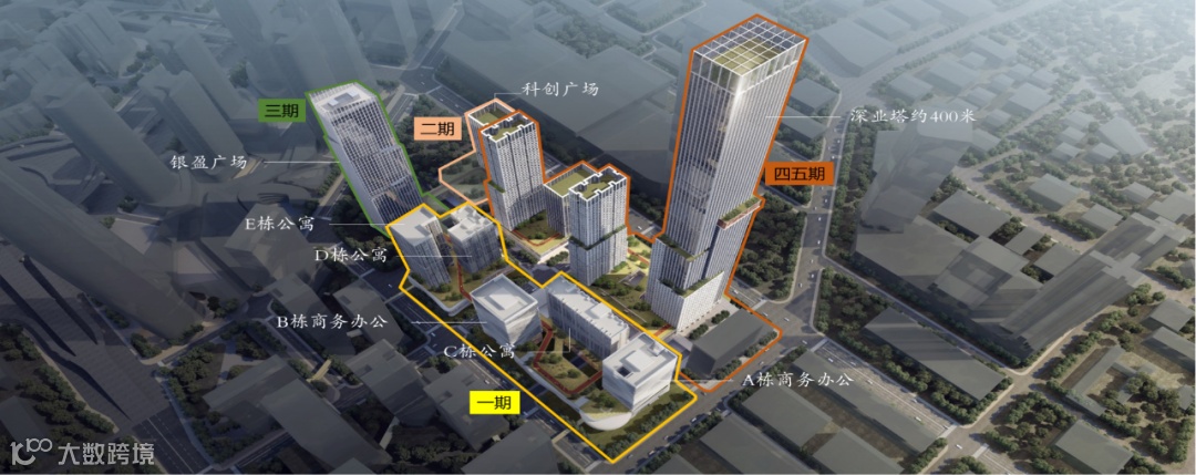 深圳百万方海绵城市综合体,整体共分为5期开发,涵盖高端公寓、办公、商业、酒店四大业态,是目前笋岗唯一超过百万方的城市更新创艺综合体。目前1期A座、B座为高端商务写字楼,C座、D座、E座为高端商务公寓。2期规划1栋产业研发大厦,3期规划1栋250米超高层甲级写字楼。东南侧是项目的4、5期用地,规划建面约50万㎡。同时,项目配备建面约20万平的商业mall,也将成为笋岗区域最大的商业消费中心。