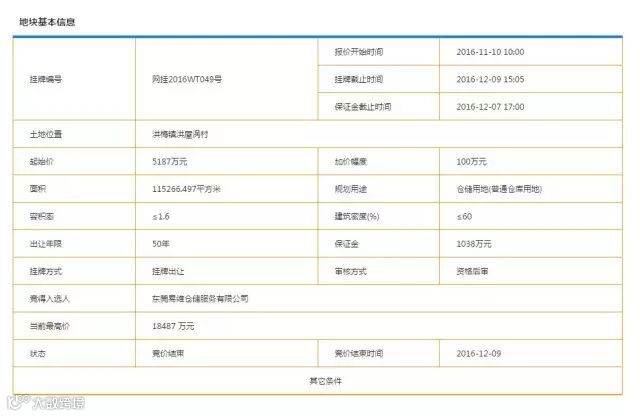 据东莞市国土资源交易网显示,12月9日下午15点10分,东莞洪梅镇洪屋涡村国有建设用地使用权挂牌出让结束,经过32轮竞价,此地块以1.8487亿元花落东莞易维仓储服务有限公司,东莞仓储用地拍卖价格又添新高。