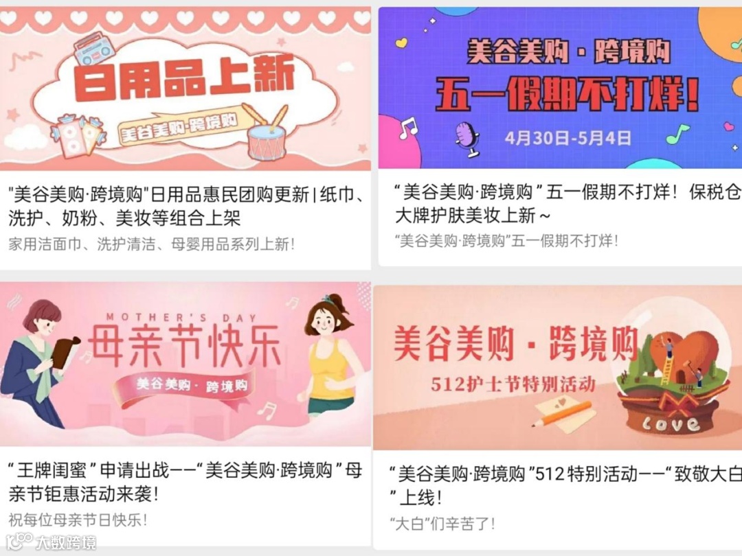 为保障疫情期间市民的日用品供应及复工企业的生活物资需求,“美谷美购跨境购 美美生活云上购”活动线上上架300多款商品,包括护肤、清洁、洗护、零食、母婴、宠物等多个品类,举办团购活动、秒杀活动、上新活动、节日专场活动、视频号直播活动40余次,“美谷美购跨境购”公众号发文12篇,浏览量43万余次。为了满足市民生活物资需求,跨境购团队千方百计扩充货源,确保民生物资保供不断“链”。
