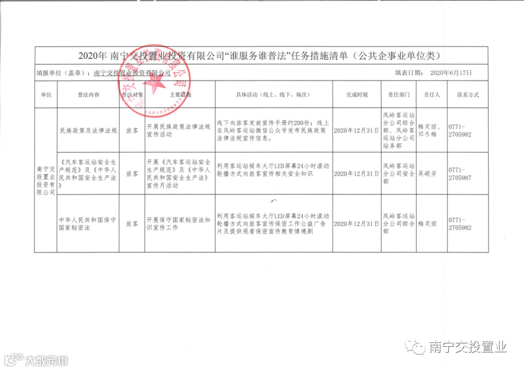 2020年南宁交投置业投资有限公司“谁服务谁普法”任务措施清单