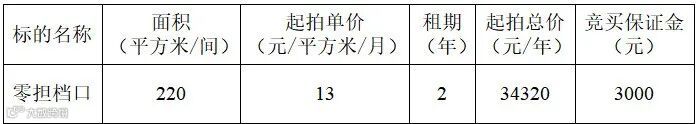 1.A4区设置14个零担档口,其中A6与401,A413与A415分属东西两侧,两间整体出租,起拍单价14元/平方米/月,起拍总价73920元,竞买保证金5000元,其余零担档口均单独起租;