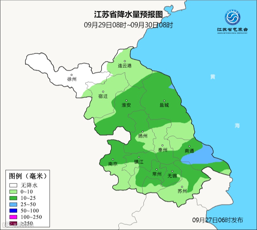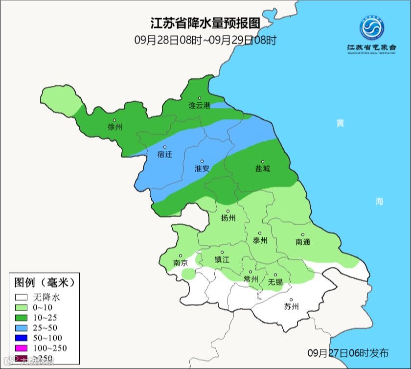 江苏省气象台2021年09月28日11时06分发布暴雨蓝色预警信号:预计未来24小时内,连云港中南部、宿迁、徐州南部、淮安和盐城中北部地区将出现12小时50毫米以上的降水,局部地区伴有短时强降水和7-9级雷暴大风等强对流天气,请注意防范。