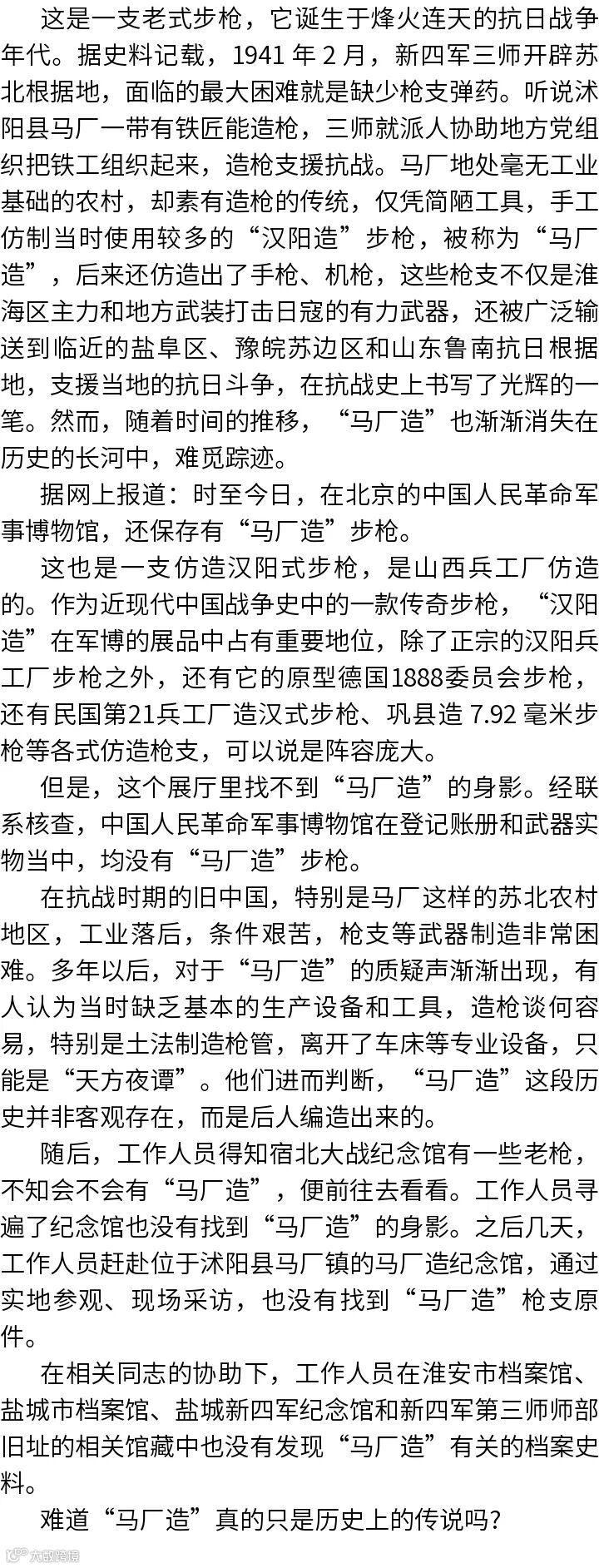据介绍,抗日战争时期,淮海抗日根据地马厂一带,生产一种仿“汉阳造”步枪,称为“马厂造”步枪。从1941年马厂铁工会成立到之后的几年时间里,马厂新造步枪7000多支,修理各式枪械1万多件,还生产了大批其他枪支和5000多把刺刀,产量仅次于八路军兵工厂,位于全国各根据地第二位。