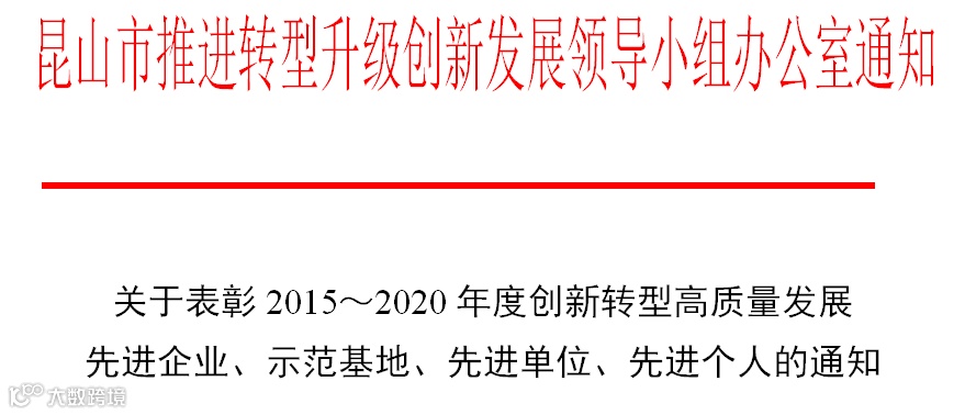 近日,昆山市推进转型升级创新发展领导小组办公室公布了《关于表彰2015-2020年度创新转型高质量发展先进企业、示范基地、先进单位、先进个人的通知》,昆山高新区一批单位和个人榜上有名。
