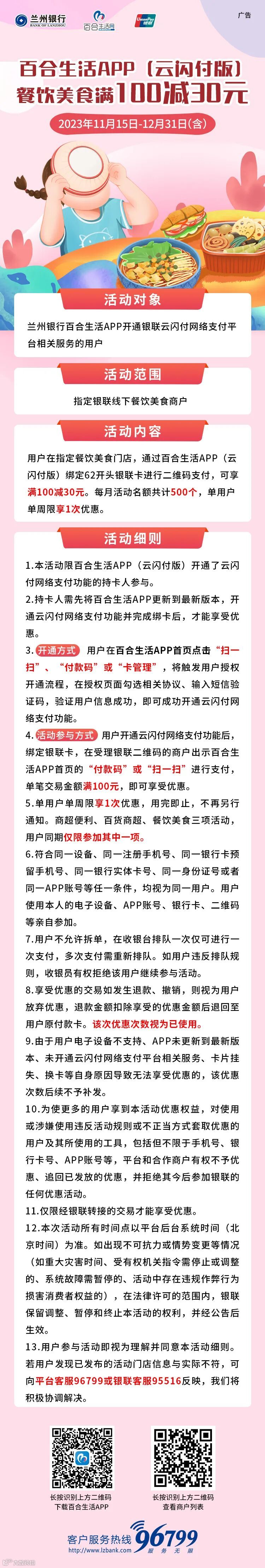 【每周1次】百合生活APP云闪付版,餐饮美食满100-30