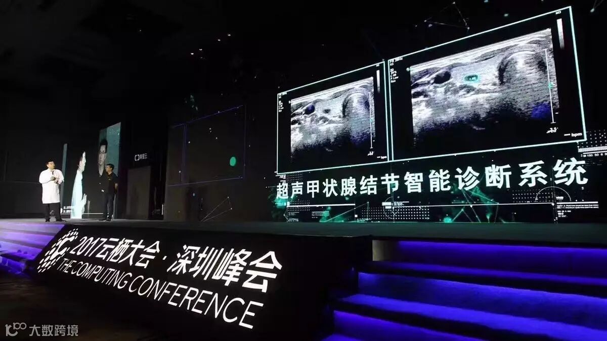 在现场,阿里云总裁胡晓明请来了一位医生为大家讲解一套超声甲状腺结节智能诊断系统的用法。借助计算机视觉技术,这套系统可以对甲状腺B超快速扫描分析,圈出结节区域,并给出良性与恶性的判断,节省了医生的诊断时间。