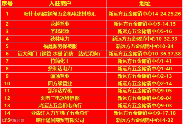 10月8日,万众期待的新远方五金储销中心终于开始试营业啦!新远方五金储销中心位于314国道西侧,喀什经济开发区北侧,深圳产业园西区的远方国际物流港园区内,主要经营五金建材、电动工具、电力设备、装修材料等。现物流港园区内有钢材、石材、建筑机械、木方模板等各类商户1200余家,五金储销中心的营业,将使远方物流港成为建筑材料、机械一站式采购基地。
