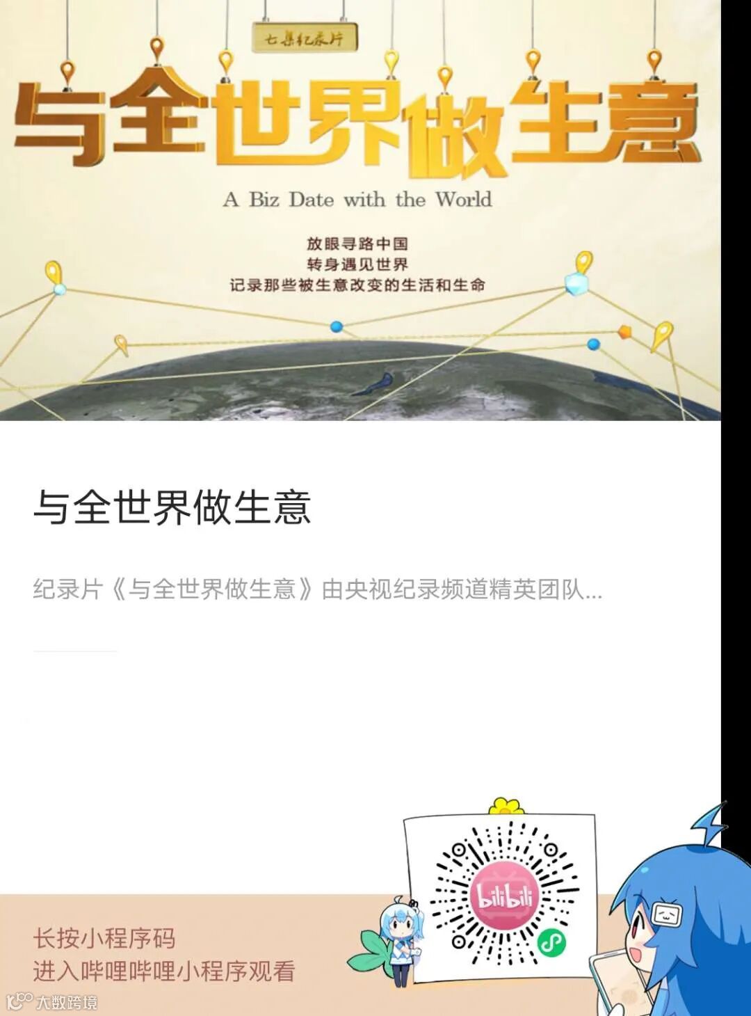简介:纪录片《与全世界做生意》由央视纪录频道精英团队制作,团队主创曾制作过纪录片《大国崛起》《公司的力量》《舌尖上的中国》等。著名音乐人小柯为本片创作主题音乐,这也是小柯首次为纪录片作曲。本片共7集,每集50分钟。记录了经济全球化背景下中国人的生存面貌以及对财富和梦想的理解;通过生意人特有的创业精神与合作理念,呈现中国人的商业智慧,展现中国和世界的有效交流和共同进步。