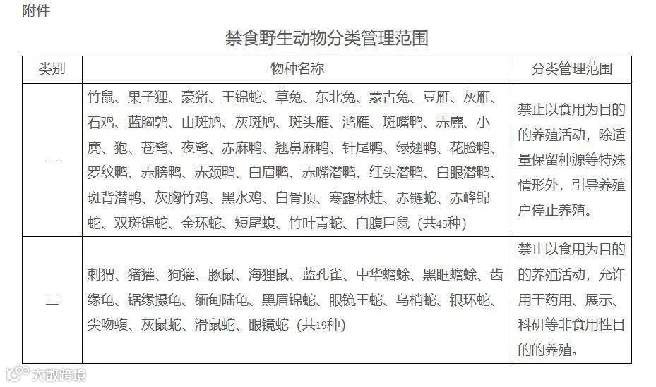 类别一所列的45种野生动物,要积极引导有关养殖户在2020年12月底前停止养殖活动,并按有关规定完成处置工作。