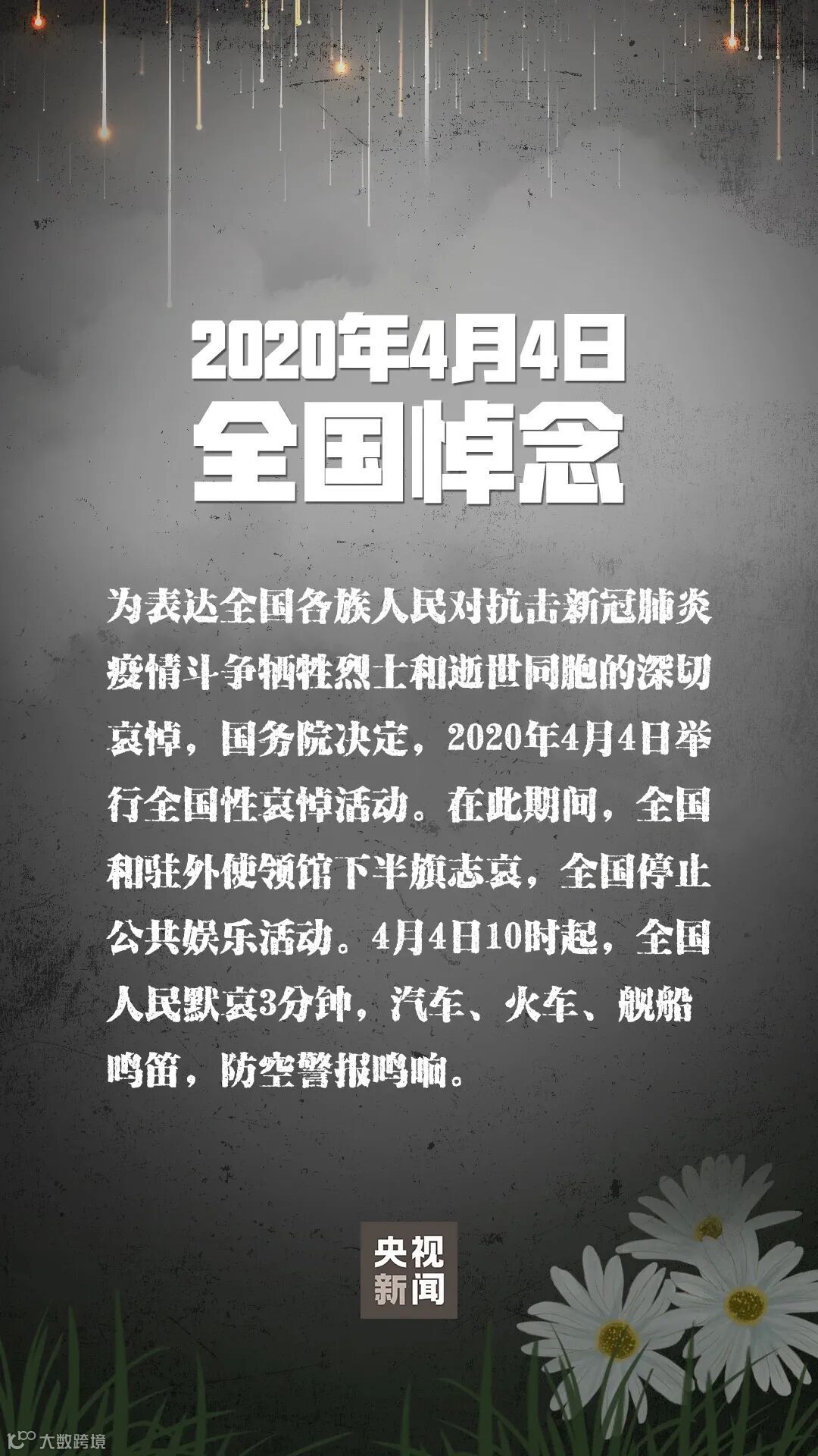 为表达全国各族人民对抗击新冠肺炎疫情斗争牺牲烈士和逝世同胞的深切哀悼,国务院4月3日发布公告,决定2020年4月4日举行全国性哀悼活动。