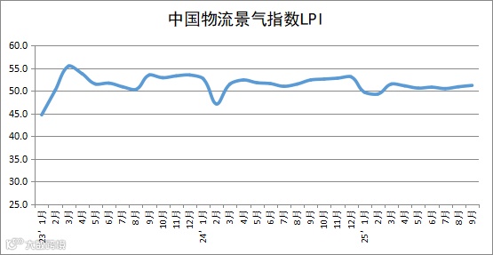 中国物流与采购联合会发布的2025年9月份中国物流业景气指数为51.2%,较上月回升0.3个百分点。