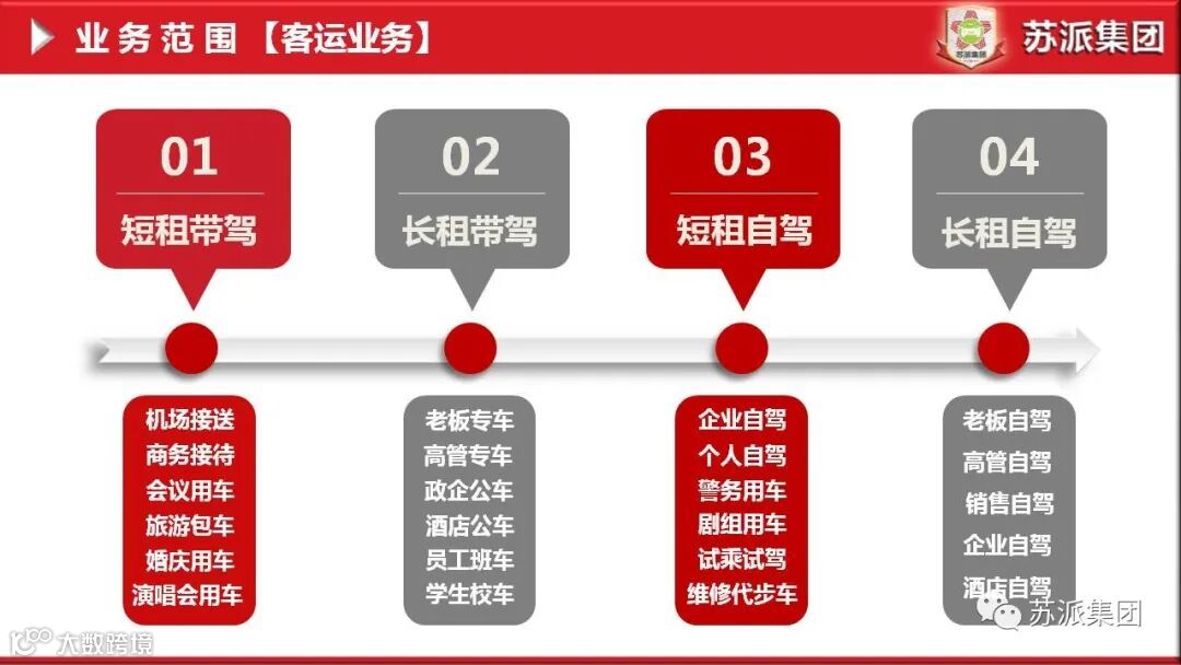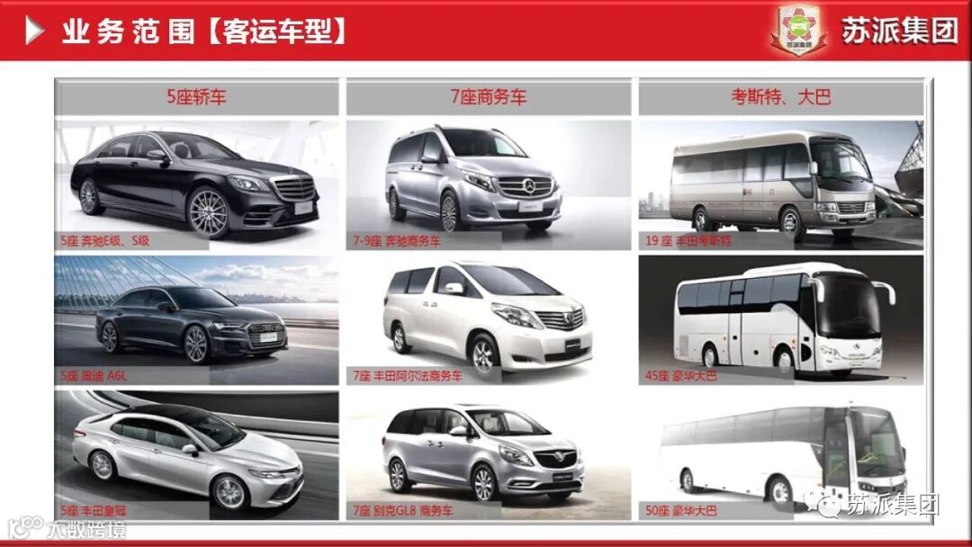 【苏派集团】是一家以物流和客运为核心,汽车租赁、销售、金融、保险、维修、充电桩、换电站、二手车、网约车、自驾游、摄影、婚庆、电商、伴手礼、危废处理等为产业配套,带动产业链同步发展的集团公司。主营:绿色城配、城际速运、接送机、班车、包车。