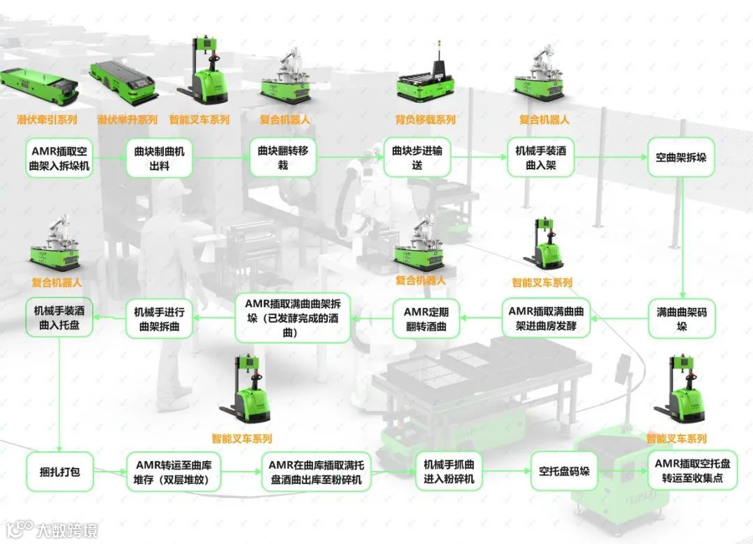 在制曲工艺中,佳顺智能有完备产品系列和软件系统,潜伏牵引系列、潜伏举升系列、智能叉车系列、潜伏移载系列可满足各种环境下曲架的搬运、移载;同时智能叉车系列可以满足高层曲架的叉取要求;复合机器人及定制系列移动机器人产品可以更灵活对接各种设备,满足场景搬运、拣取要求;