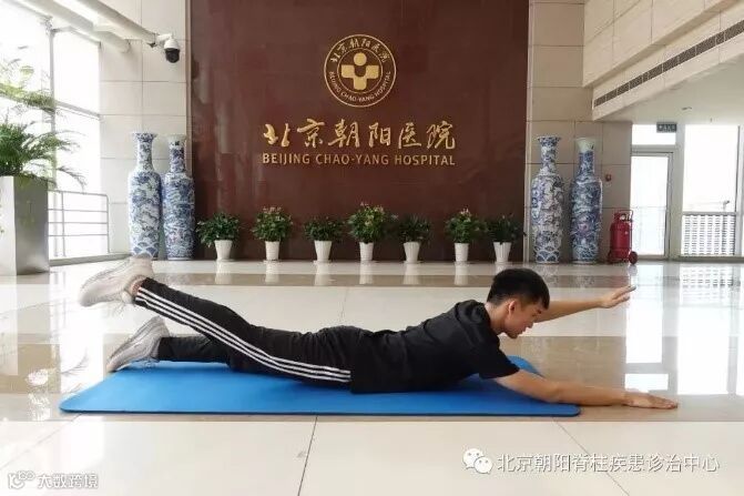 在垫子上或者床上俯卧挺身,左手伸直全力前伸,右腿后伸,同时做抬头挺胸动作。每次动作保持5-10秒,重复20~30次,共练习5组。