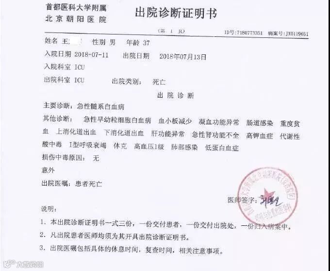 租房合同显示,这名员工自2018年5月8日起租住自如房子,没有人知道他的身体开始出现异样是什么时候。“他七月份跟我说过自己感觉不舒服,像得了重感冒,在杭州回北京的高铁上,他说自己的腿破了流血止不住。”逝者的妻子提到,7月10日,丈夫在首都医科大学附属朝阳医院门诊被初步诊断为急性白血病,并留院观察,次日确诊,转到血液科。无奈病情发展迅速,确诊三天后他便离世。