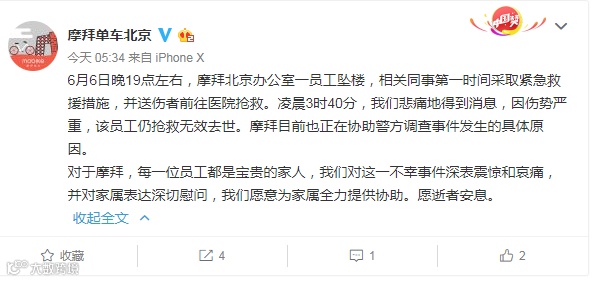 摩拜北京办公室官方微博发布消息称,办公室某员工于6月6日晚19点左右坠楼,凌晨3时40分时因伤势严重,该员工抢救无效去世。