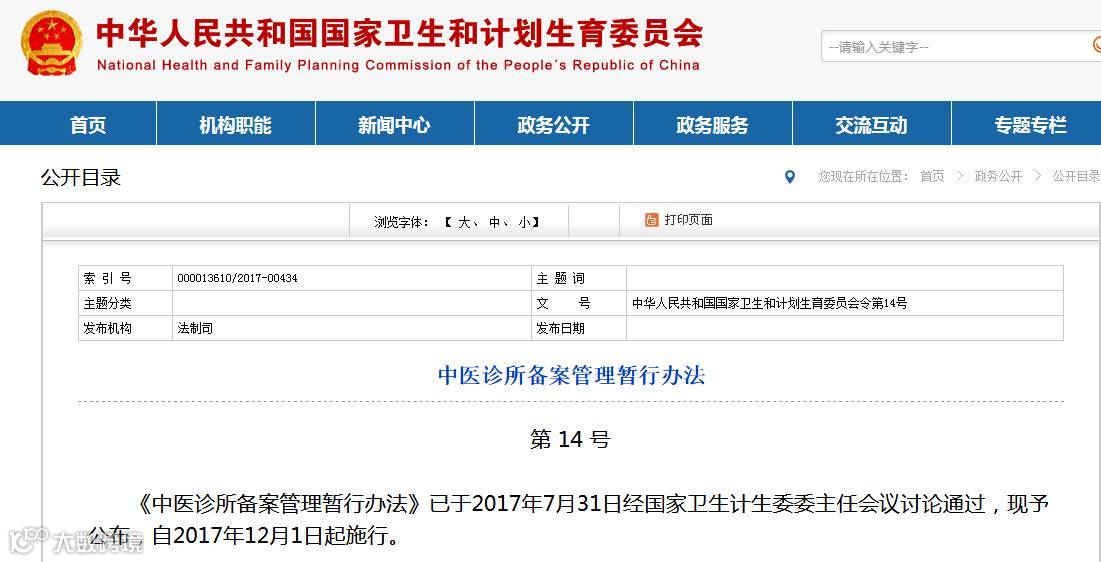 日前,国家卫生计生委发布第14号令,印发《中医诊所备案管理暂行办法》(下称《暂行办法》),明确将中医诊所由许可管理改为备案管理。2017年12月1日,《暂行办法》正式实施。