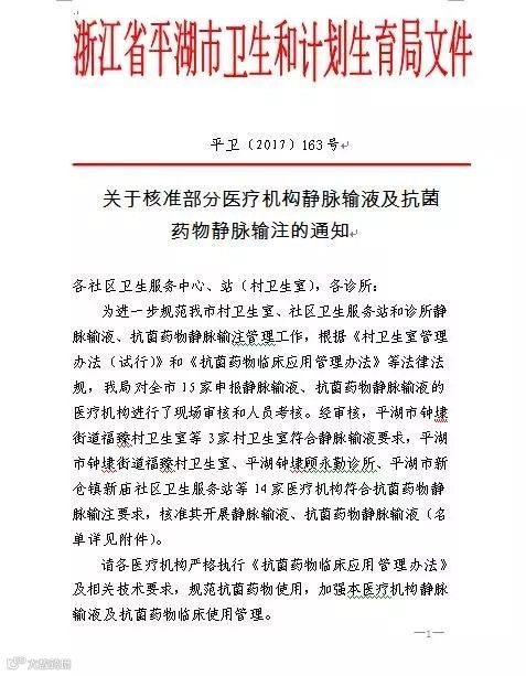 近日,浙江省平湖市清洁计生局发文,平湖市14家村清洁室(社区清洁服务站)、诊所运用抗菌药物展开静脉输注活动取得核准,取得运用抗菌药物“挂盐水”资历。平湖其它100余家未经核准的村清洁室(社区清洁服务站)、诊所等基层医疗组织,往后都不得展开抗菌药物静脉输液了。