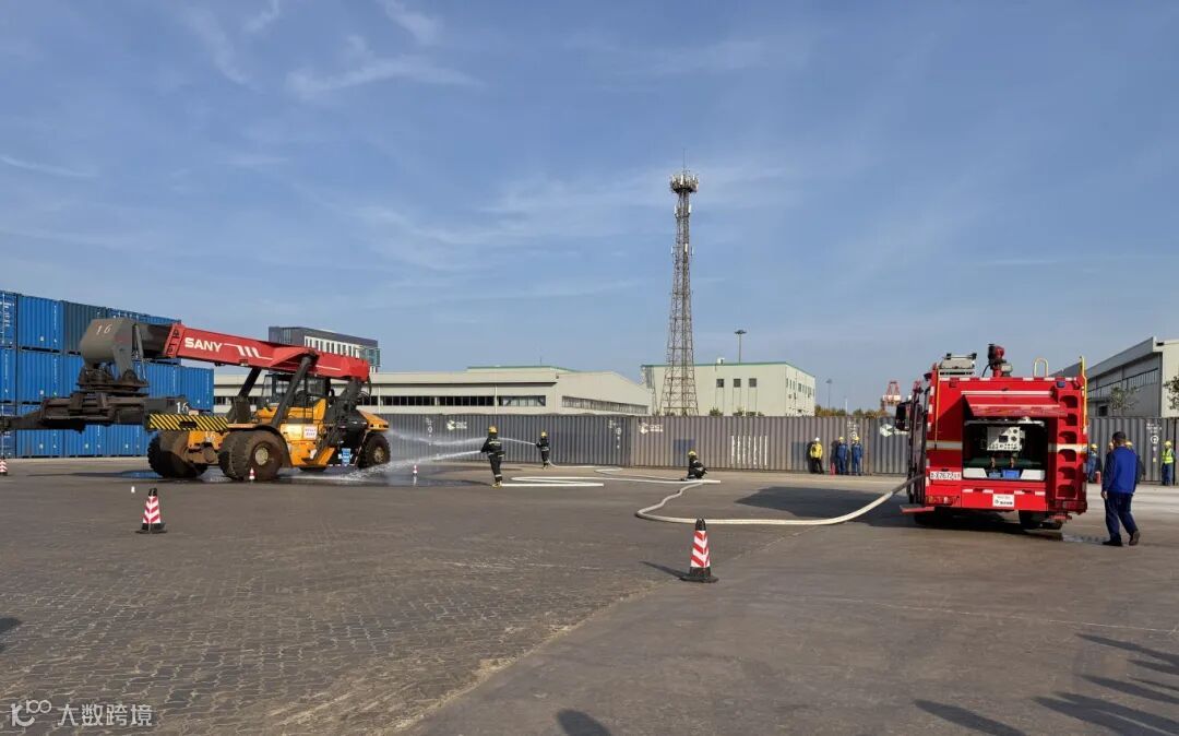 在随后开展的正面吊冒烟起火应急演练中,日照区域公司和消防应急大队紧密配合,按应急处置方案,依次对火情报警、组织疏散、现场封闭、火灾扑救等各环节进行模拟。