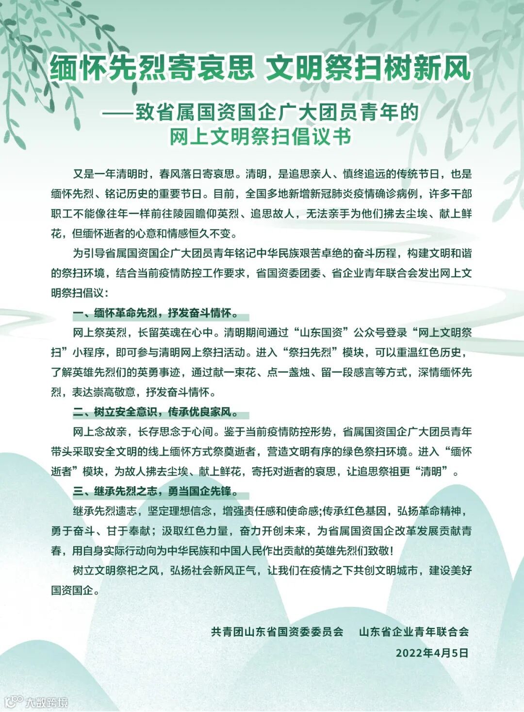 长按并识别上方二维码,即可进入山东省国资委云祭扫页面,通过“点击进入”,对话框中会出现“祭扫先烈”和“缅怀逝者”两个专题,分别点击进入专题进行网上祭扫并留下您宝贵的寄语。