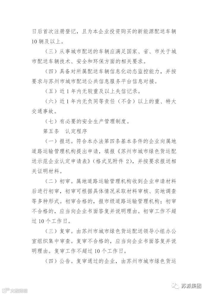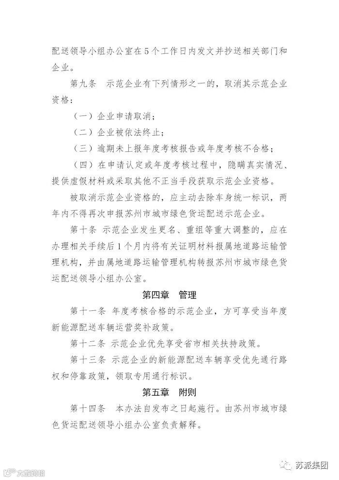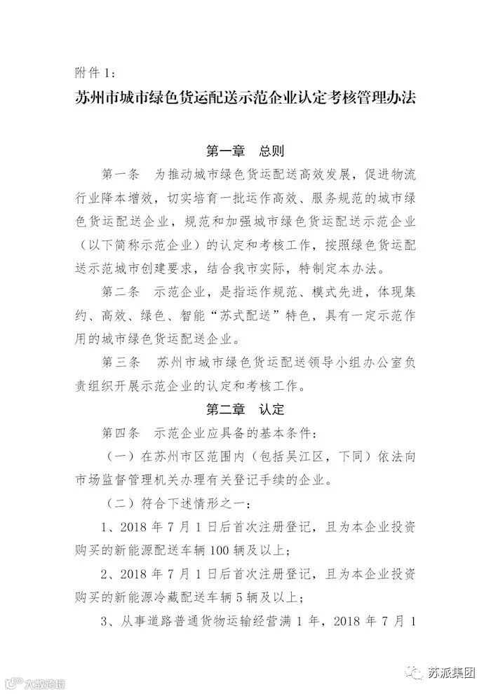 2019年10月25日,苏州市城市绿色货运配送领导小组办公室印发关于《苏州市城市绿色货运配送示范企业认定考核管理办法》(以下简称《管理办法》)通知,对示范企业认定规则、考核标准、管理办法等相关事项进行公布。