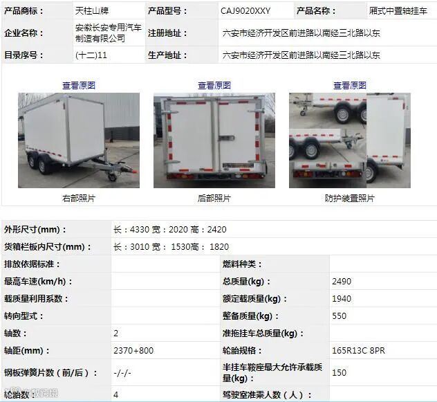 除了上面的主流车型之外,330批公告中还有几款中置轴车型“独具特色”,其中安徽长安生产的中置轴厢车长度不到5米,可选择单轴可双轴版本,最大重质量不超过3吨,也许是为轻卡、皮卡量身打造的。
