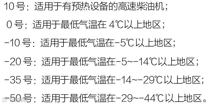 柴油按凝点分为10号、0号、-10号、-20号、-35号、-50号六种牌号,分别对应不同的温度: