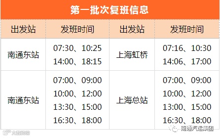 其中:第一批次“南通汽车客运东站—上海虹桥客运西站、南通汽车客运东站—上海总站”客运班次将于8月8日起正式恢复。其他南通始发班次以及县(市)区往返上海的道路客运班次也将有序恢复。具体信息广大旅客可通过“南通汽运集团”微信公众号、“巴士管家”APP查询实时班次信息和购票。
