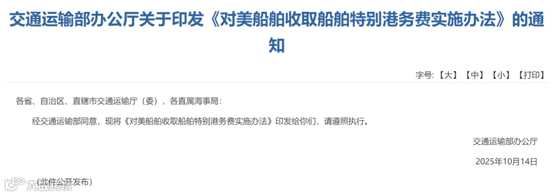 (一)自2025年10月14日起靠泊中国港口的,按每净吨400元人民币计收;