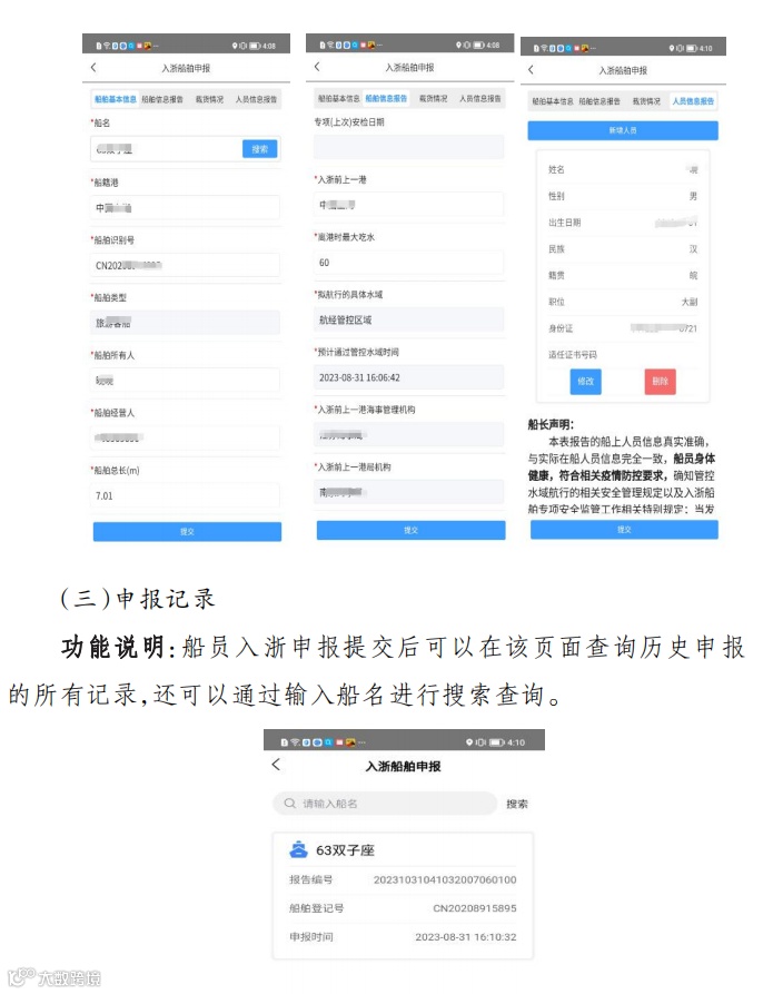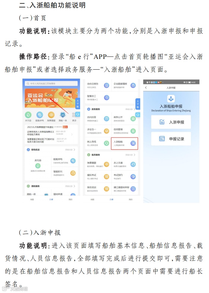 (一)拟进入浙江水域的国内航行船舶应在办理船舶出港报告前,通过“船e行”APP报告船舶、载货、船上人员等信息(操作指南附后)。