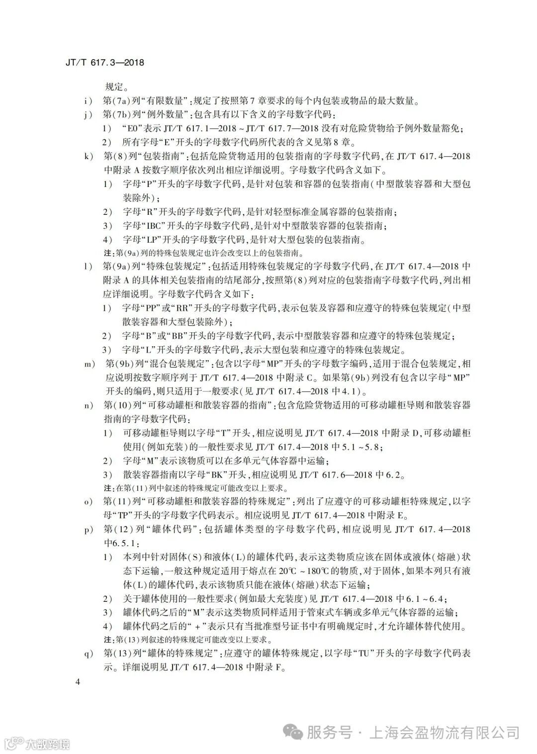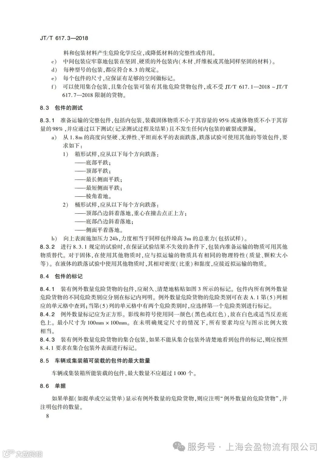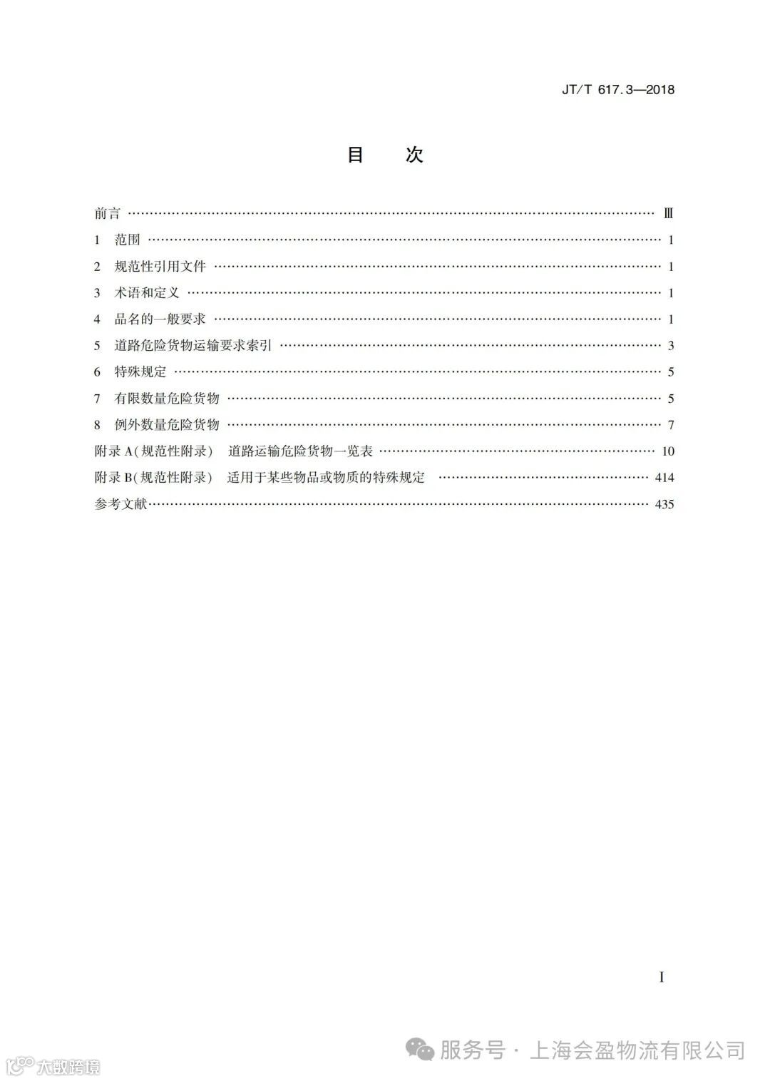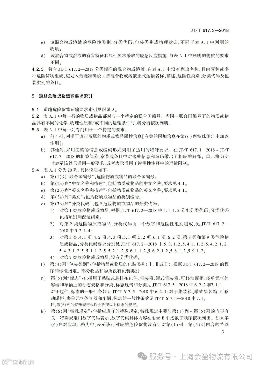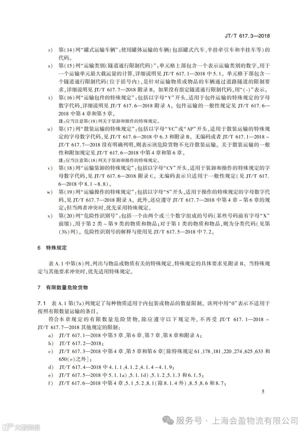 上海会盈物流有限公司JT/T 617 的本部分规定了道路运输危险货物品名的一般要求、道路危险货物运输要求索引、特殊规定,以及有限数量危险货物和例外数量危险货物的道路运输要求。本部分适用于危险货物道路运输。