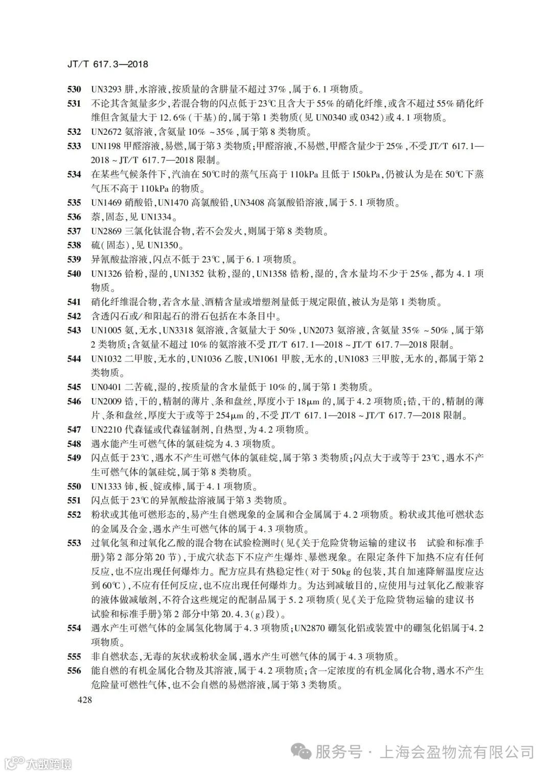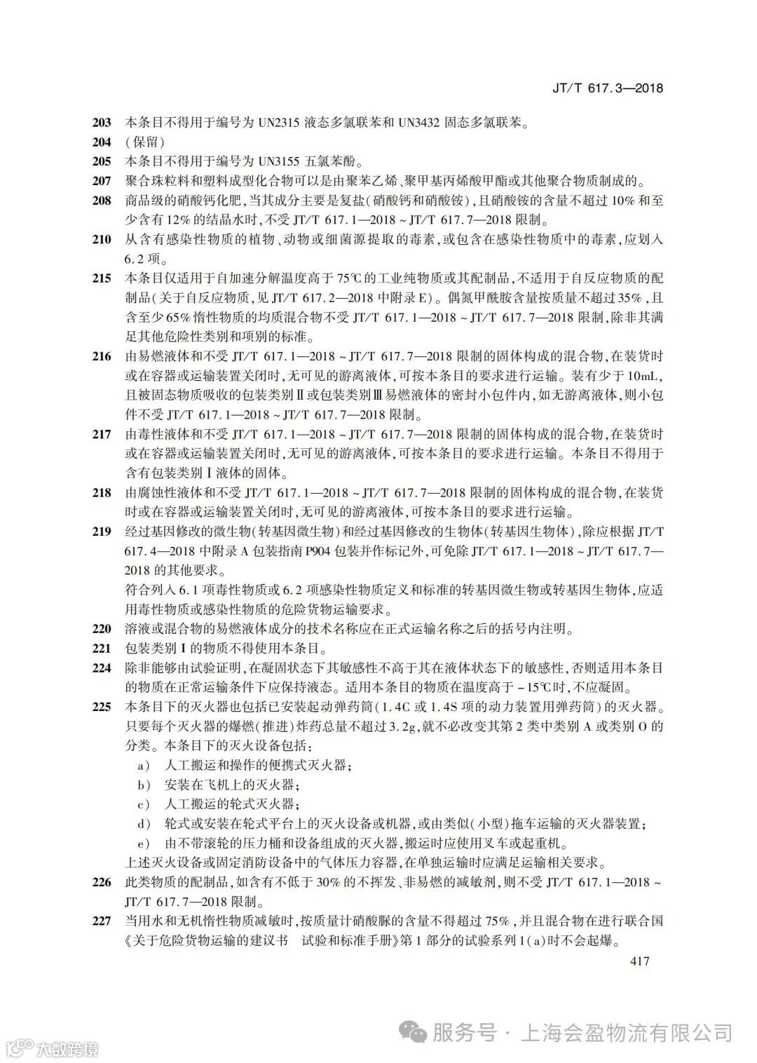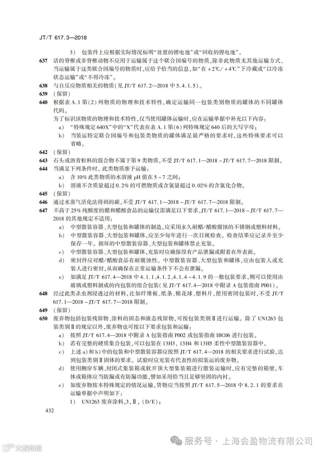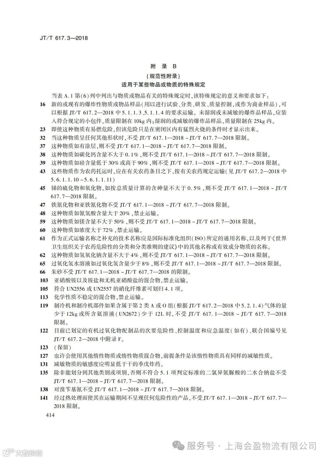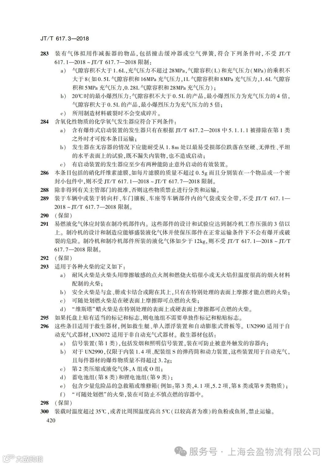 上海会盈物流有限公司JT/T 617 的本部分规定了道路运输危险货物品名的一般要求、道路危险货物运输要求索引、特殊规定,以及有限数量危险货物和例外数量危险货物的道路运输要求。本部分适用于危险货物道路运输。