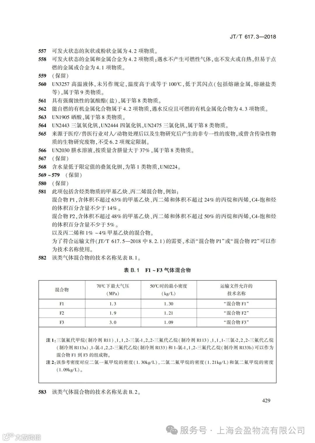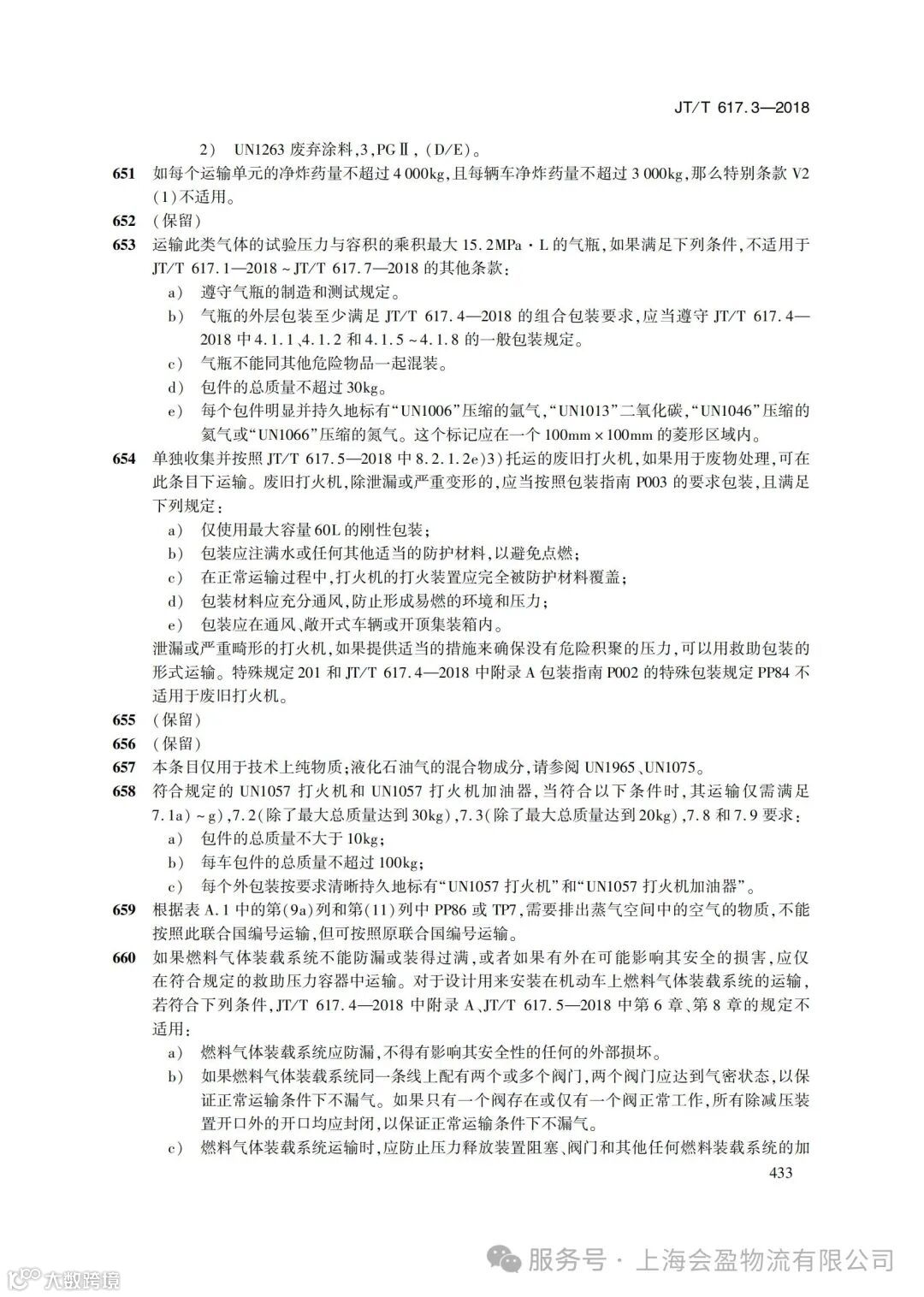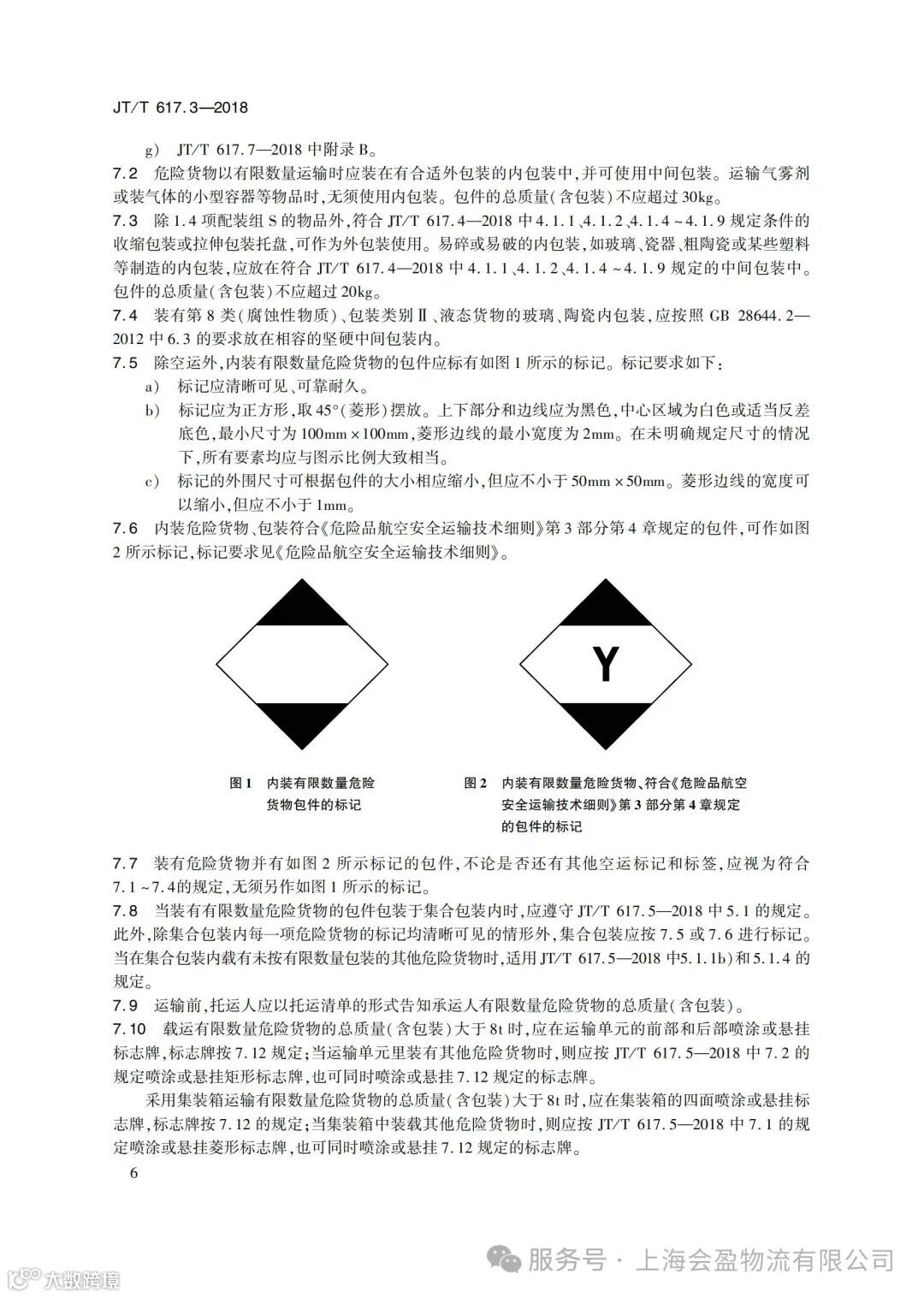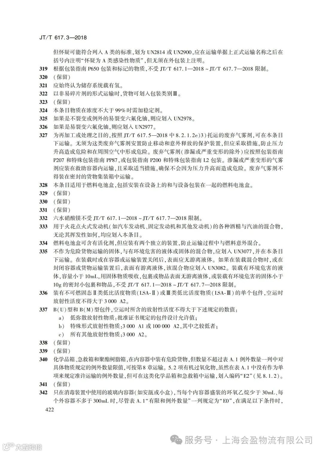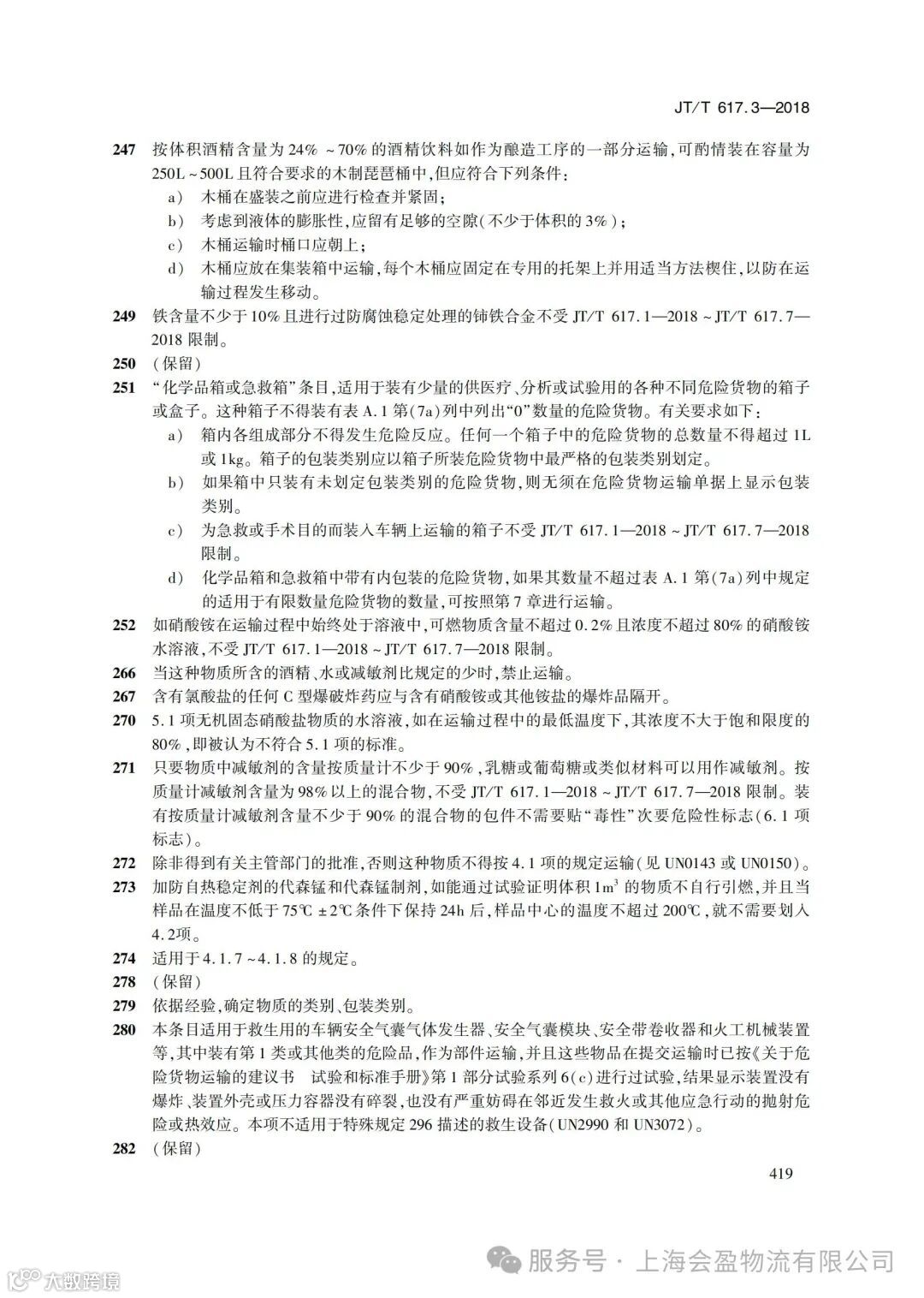 上海会盈物流有限公司JT/T 617 的本部分规定了道路运输危险货物品名的一般要求、道路危险货物运输要求索引、特殊规定,以及有限数量危险货物和例外数量危险货物的道路运输要求。本部分适用于危险货物道路运输。