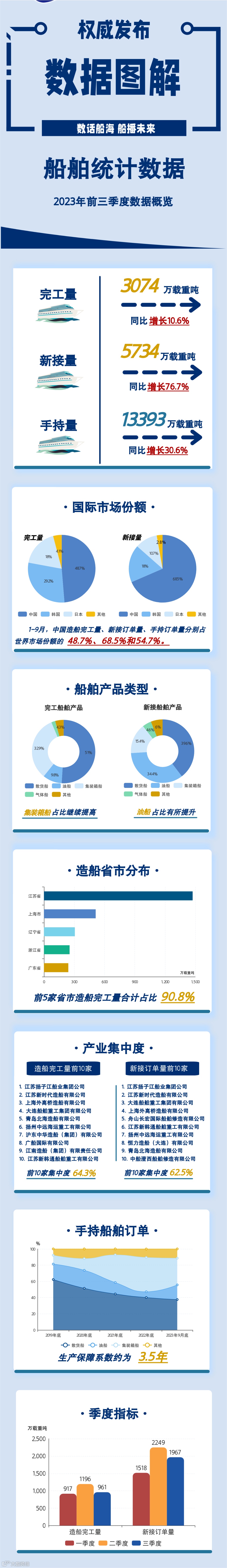 2023年前三季度,造船产业集中度保持在较高水平,造船完工量前10家企业占全国64.3%,新承接订单量前10家企业占全国62.5%,手持订单量前10家企业占全国61.2%。