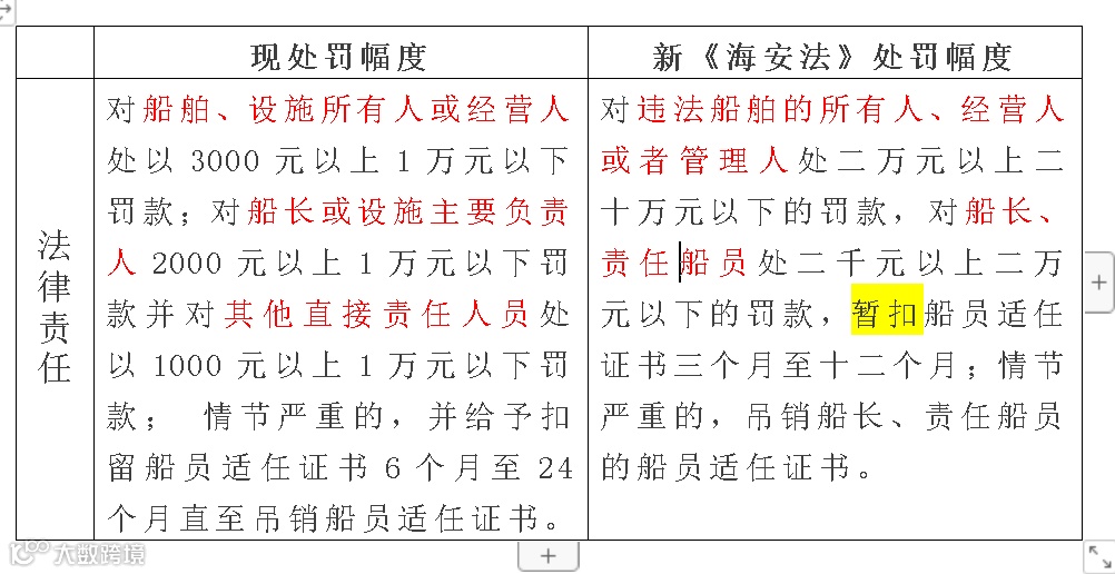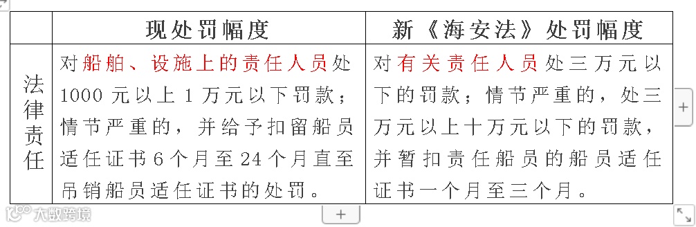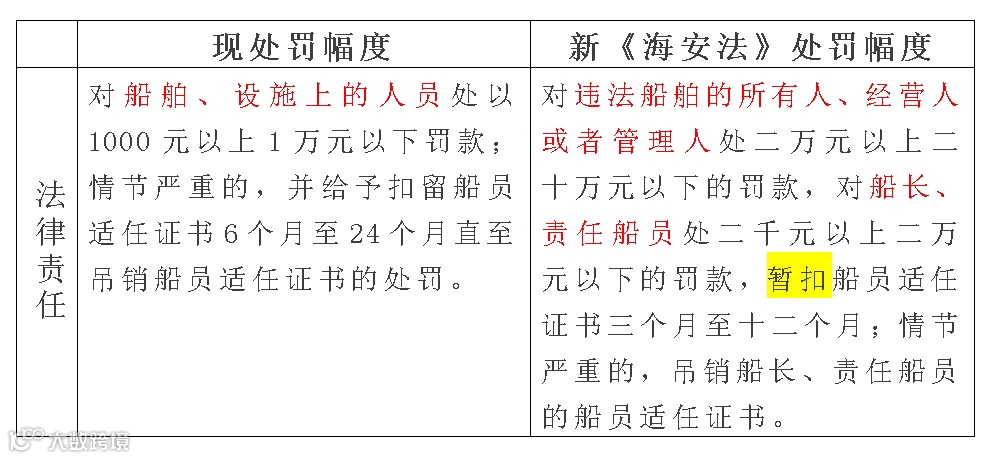 1、部分违法行为的处罚对象由原来的“船长”变为“船舶所有人、经营人或者管理人“以及”船长、责任船员”;