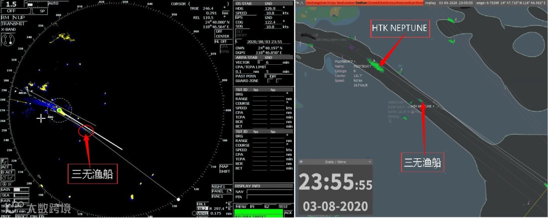 2355时许,"H"轮过泉州湾5号浮,航速10.8节,引航员下令航向127°。(此时“三无”渔船正横泉州湾4号浮,航迹向123°,航速约6.8节,两船相距约0.5海里。)