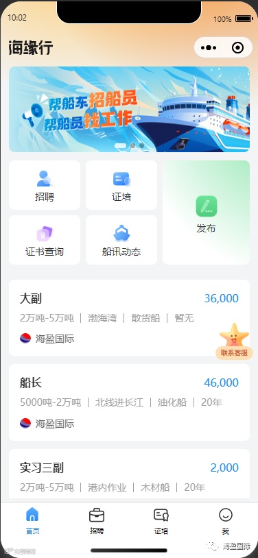 暮秋已别,顺问冬安。转眼间已进入岁末年初,泉州海盈船务有限公司研发团队经过刻苦公关和研发,拥有自主知识产权的“海缘行”综合服务平台已进入测试拟上线阶段。“海缘行”立项于公司数字化转型升级的重要时期,是公司科技创新、数字人力资源服务创新的重要举措。“海缘行”综合服务平台将搭载于微信和抖音平台,服务于全国船员、船东、船舶、航运服务企业。