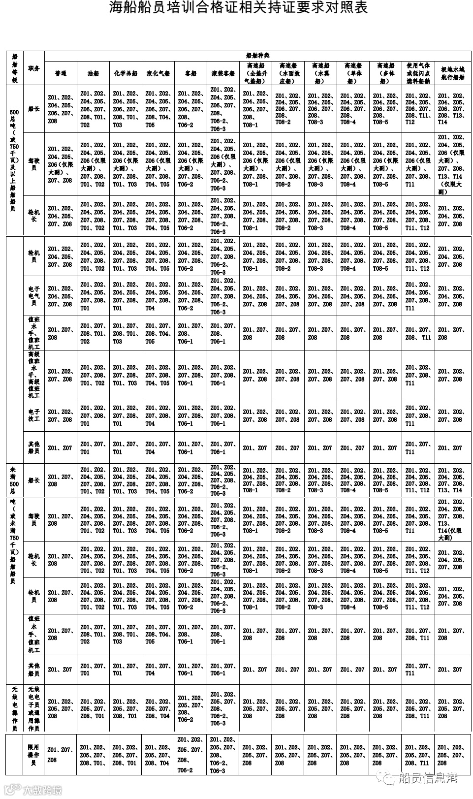 那么,以上29种培训合格证,什么船舶,什么职务的船员需要持有什么证书呢?请对照以下持证要求对照表: