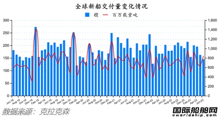 从船型来看,散货船的交付数量为254艘,共19037035载重吨;集装箱船的交付数量为152艘,共计978919TEU;油船的交付数量为93艘,共计8958760载重吨;化学品船的交付数量为53艘,共计1501539载重吨;液化气船交付数量为60艘,共计4468410立方米;海工船交付数量为283艘,共计1475913载重吨;其他船型交付数量为175艘,共计845944载重吨。