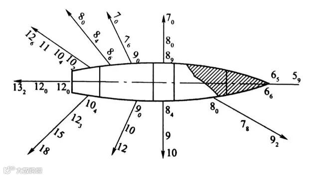 对搁浅船船体周围进行测深,以便确定搁浅程度。若海面涌浪较大而无法准确测量时,可用铅锤测量主甲板至海底之间的距离间接获得水深。所测得的水深资料应在大比例尺海图或草图上的船体周围进行标注,以表明船舶搁浅程度。测量舷边水深方法可自船首向两舷每隔lOm 测一个点(如下图所示),测量船体周围的水深应从船边开始以辐射方向进行。在测深的同时,还应采样海底底质,底质不仅影响摩擦力,而且底质及海底坡度还影响锚的抓力。