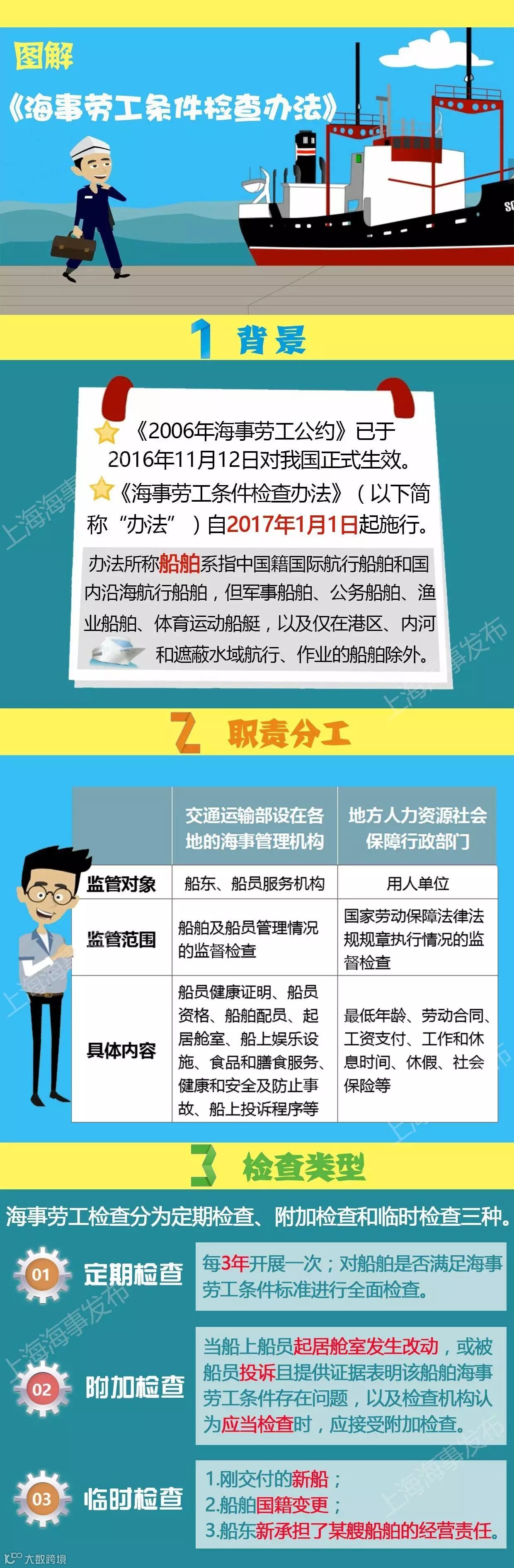 为履行好《2006年海事劳工公约》,保护船员的合法权益,交通运输部、人力资源社会保障部制定了《海事劳工条件检查办法》,自2017年1月1日 起施行。海事劳工条件检查办法,究竟怎么查?下面就用一张图,让大家有更直观的了解。