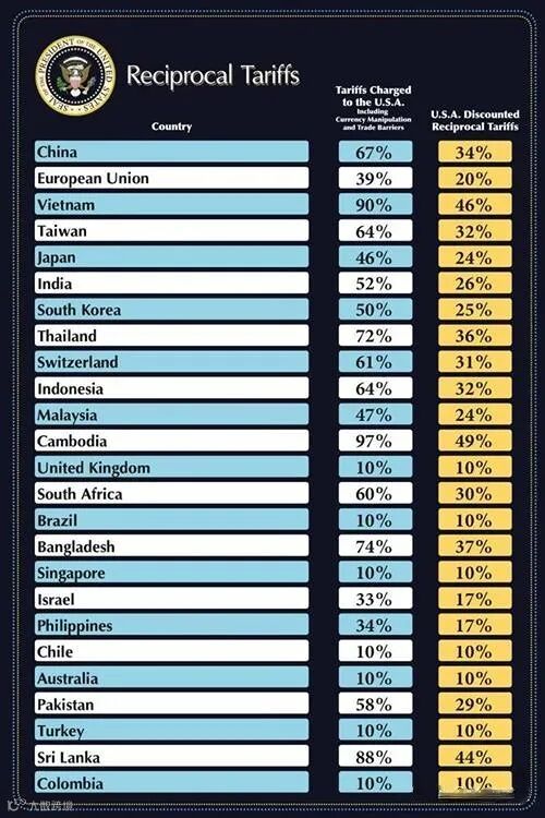 基础关税(10%)自4月5日生效,对等关税自4月9日生效。