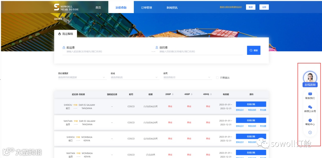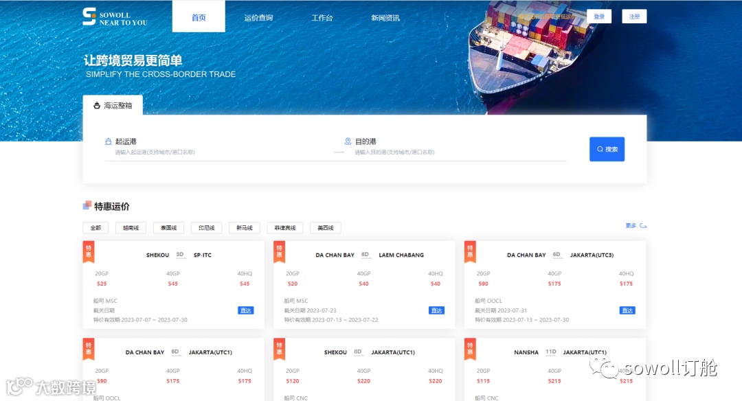 Sowoll提供全球海运运价查询、各国航线在线订舱、在线客服、物流追踪、个人工作台等功能,始终站在客户的需求出发,帮助客户解决海运物流一切问题,成为最信赖的物流合作伙伴。