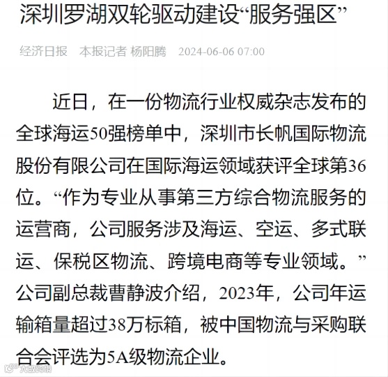 在经济日报的聚光灯下,长帆国际物流的每一步都更加坚定与自信。我们深知,这份荣誉是对过去的肯定,更是对未来的期许。长帆将持续优化物流解决方案,深化技术创新与服务升级,与罗湖区同频共振,共谋服务业转型升级新篇章,向着构建世界级物流服务体系的目标稳健迈进。