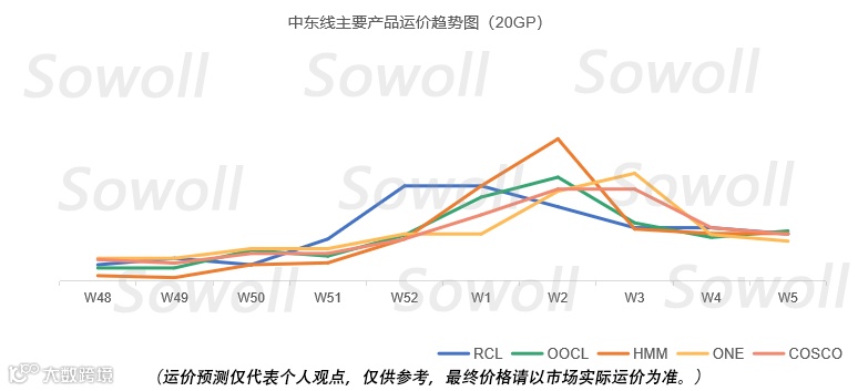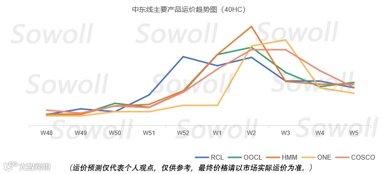 1月是中国春节假期出货高峰,加上红海问题持续恶化,中上旬价格飞涨,加班船次增加。但下旬起国内工厂陆续放假,船公司为加大收货力度,调降运价,低价位船司接连爆舱,集装箱紧俏。2月节前、节中运价很难再涨,大致会沿用1月底运价。但如果红海问题得不缓解,节后中东运价仍会处于高价位。