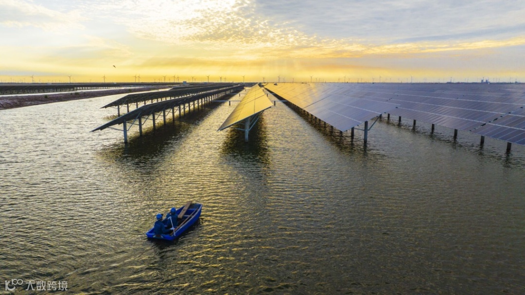 市沾化区滨海镇15千米的通汇“渔光一体”发电项目现场,一排排光伏板整齐排列,宛若蓝色海洋。)