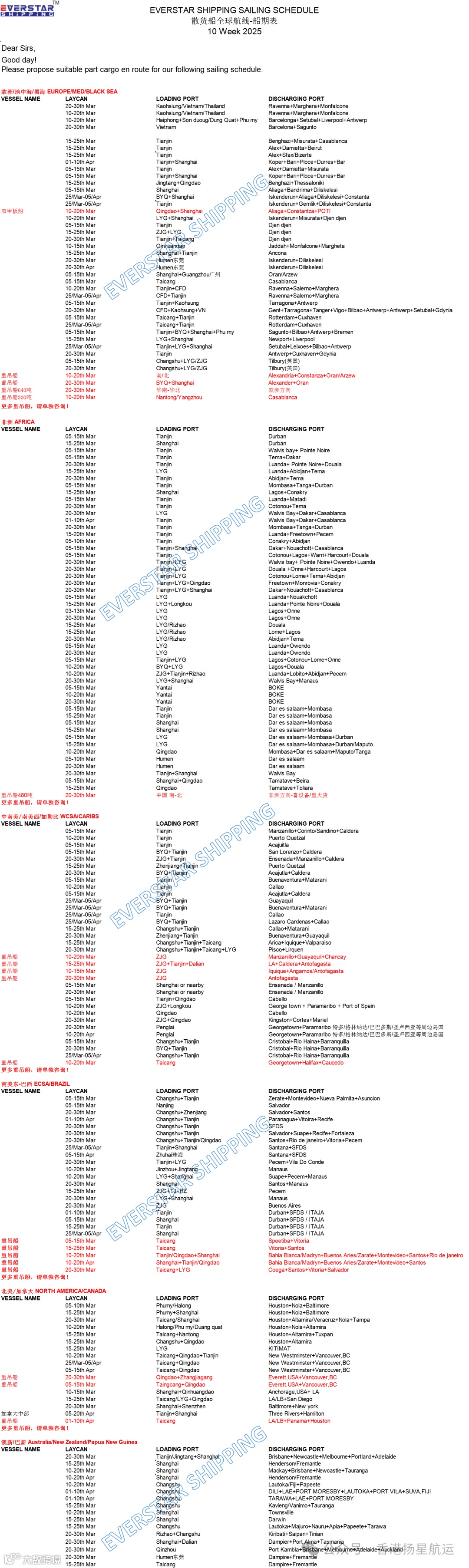 2025年3月大中华区散杂船期表(第10周) 欧地黑南北美非澳 - SAILING SCHEDULE 香港扬星航运