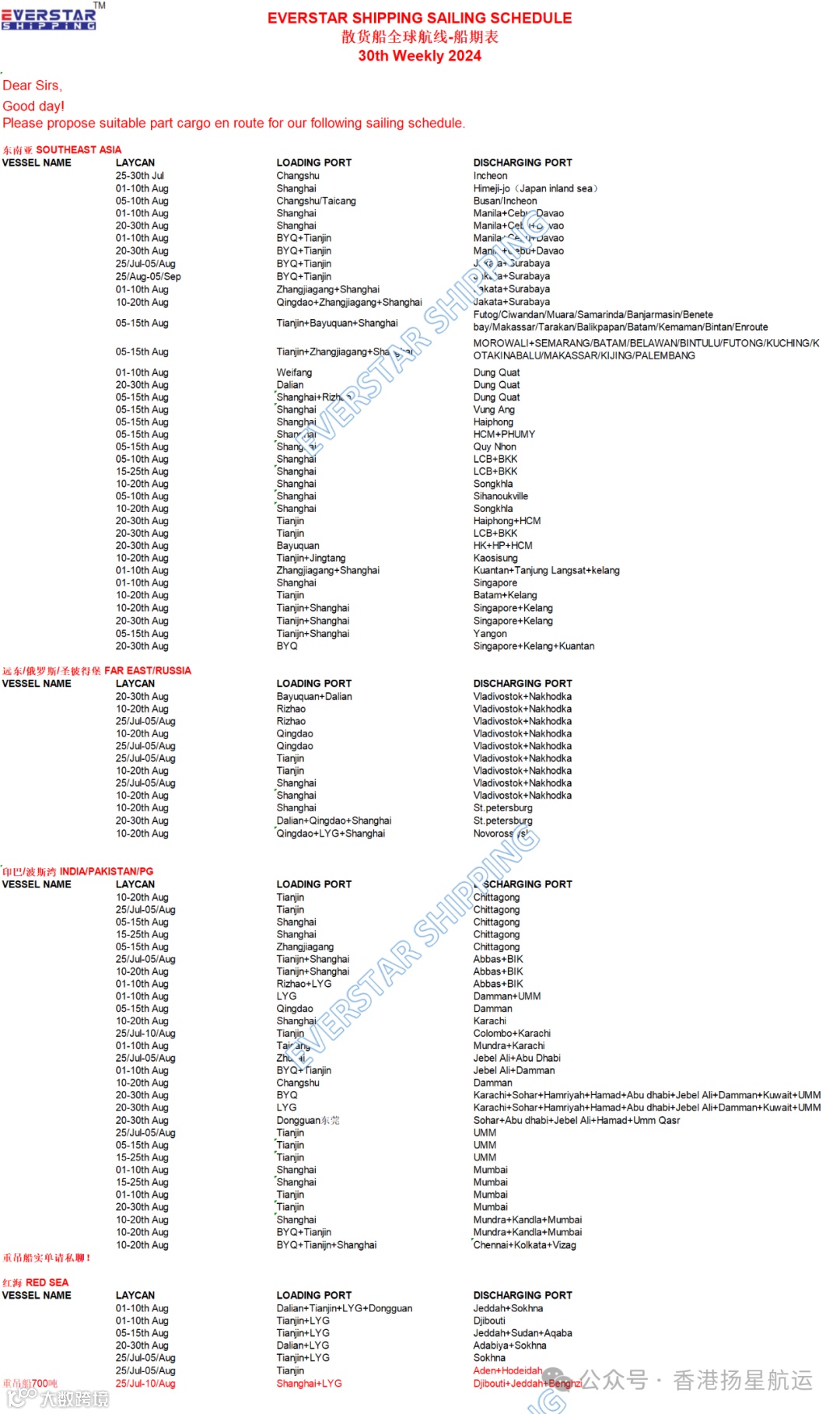 2024年8月大中华区散杂船期表(第30周)东南亚,远东波斯湾红海 - SAILING SCHEDULE 香港扬星航运