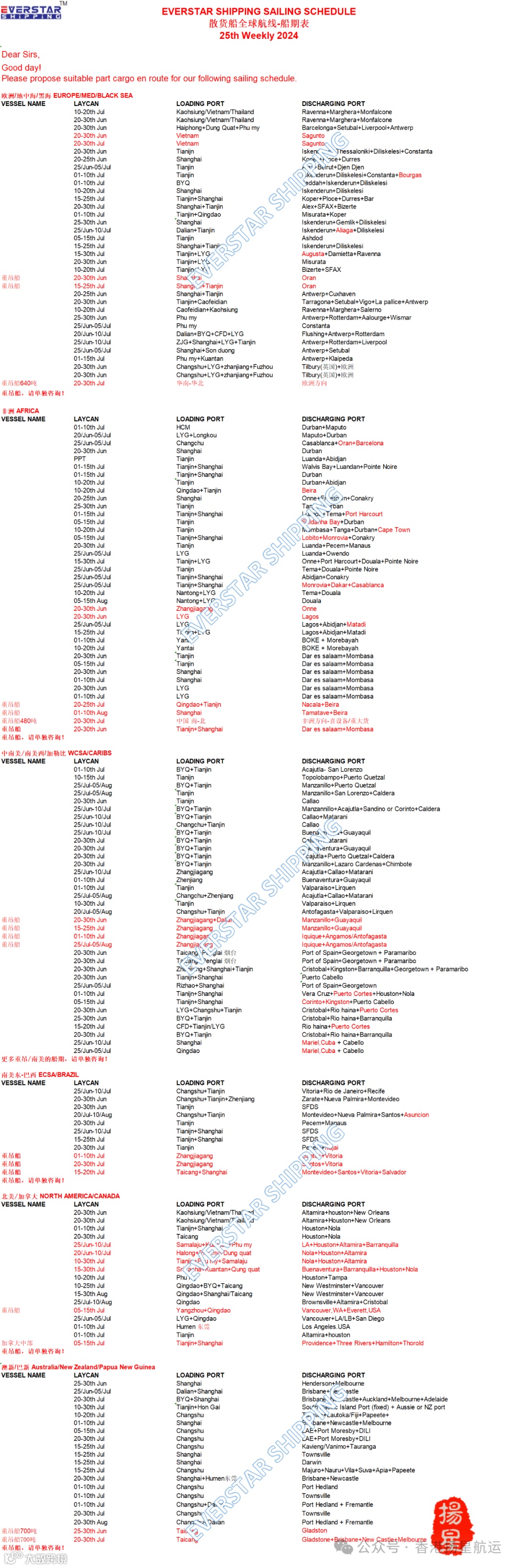 2024年6月大中华区散杂船期表(第25周)欧地黑南北美非澳 - SAILING SCHEDULE 香港扬星航运