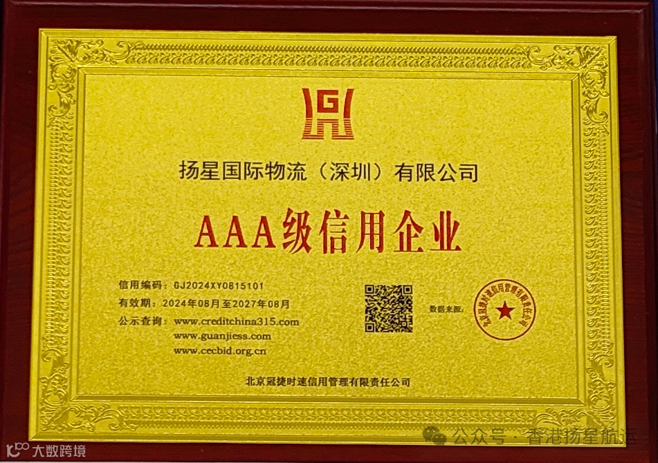 信用,是一家企业宝贵的无形资产,是企业的名片和市场通行证,2024年8月15日,扬星国际物流(深圳)有限公司(以下简称“我公司”)顺利通过AAA信用体系认证,获得“AAA级信用企业”、“AAA级重合同守信用企业”、“AAA级质量服务诚信单位”、“AAA级诚信经营示范单位”、“AAA级诚信供应商”、“中国诚信企业家”、“AAA级资信企业”十项重量级荣誉!AAA信用体系认证是全国开展行业信用评级的政府措施,属于国家级企业信用等级评价,是企业信用评价中最高的信用等级,表示企业经营健康,发展前景广,风险防范能力强,是最可信赖的商业合作伙伴。